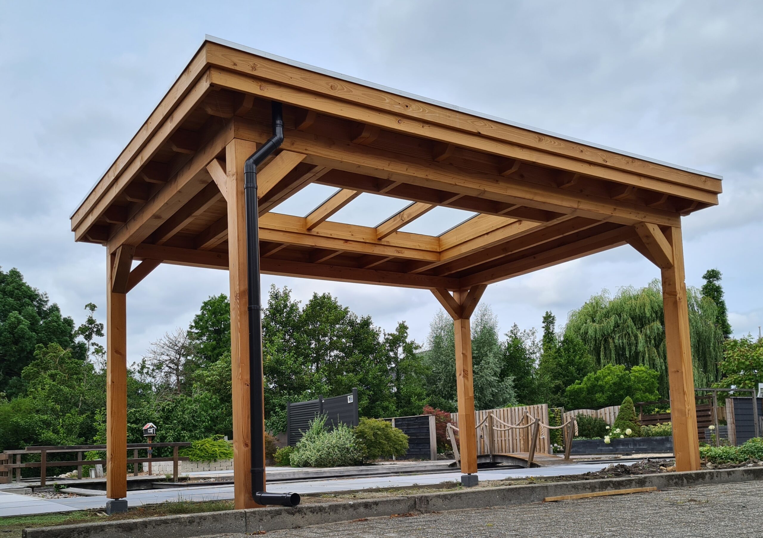 De klassieke vormgeving met dakoverhang geeft de constructie een elegante en klassieke uitstraling. Wilt u later meer comfort of privacy? Dan is de onderconstructie eenvoudig uit te breiden met bijvoorbeeld houten of glazen zijwanden of schuifdeuren. Zo bouwt u uw overkapping helemaal naar eigen wens verder op. Vraag onze experts naar tips en mogelijkheden voor de fundering.